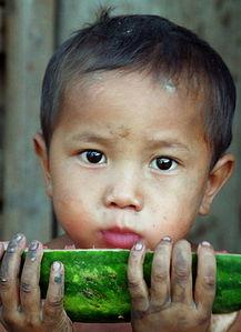 男子看着小孩,笑着说:“宝贝,这个西瓜甜不甜?”小孩点点头,嘴里含着西瓜,开心地回答:“甜!甜!”男子也跟着吃了起来,父子俩一边吃瓜,一边聊天,其乐融融。